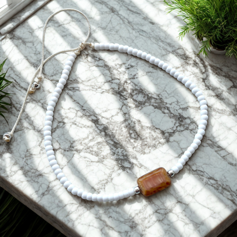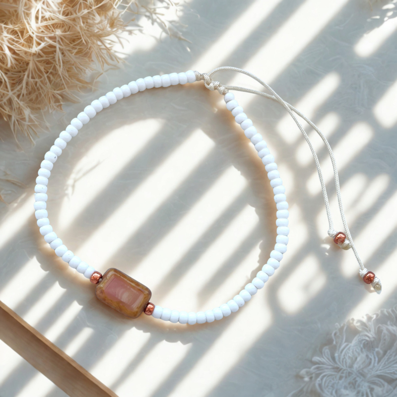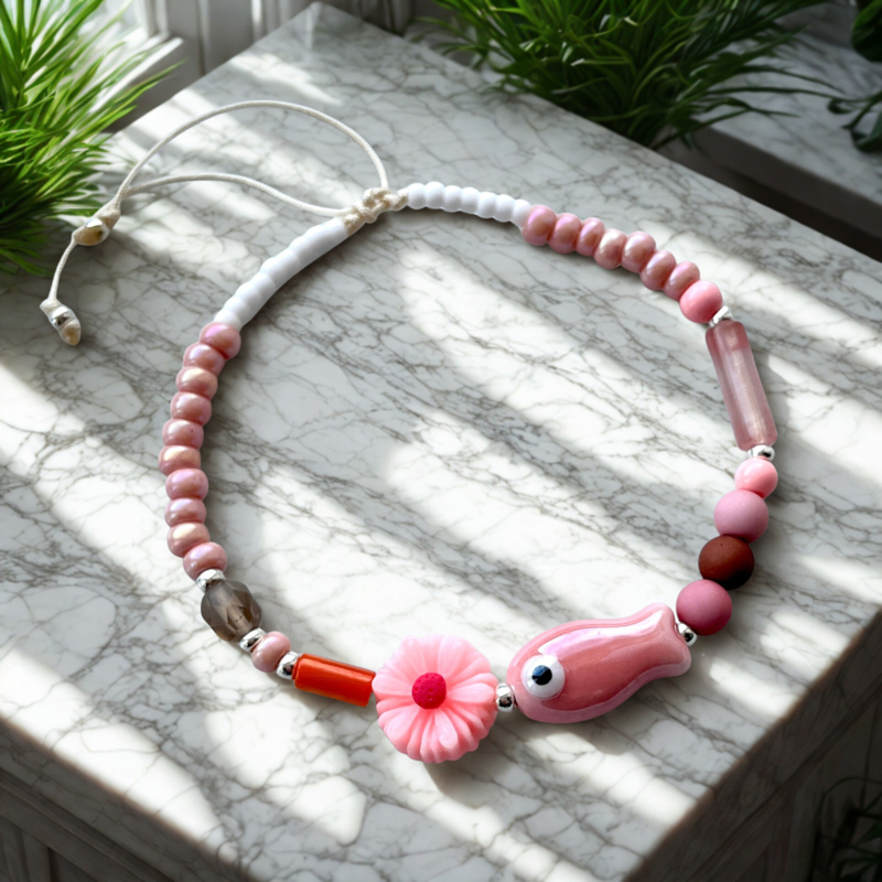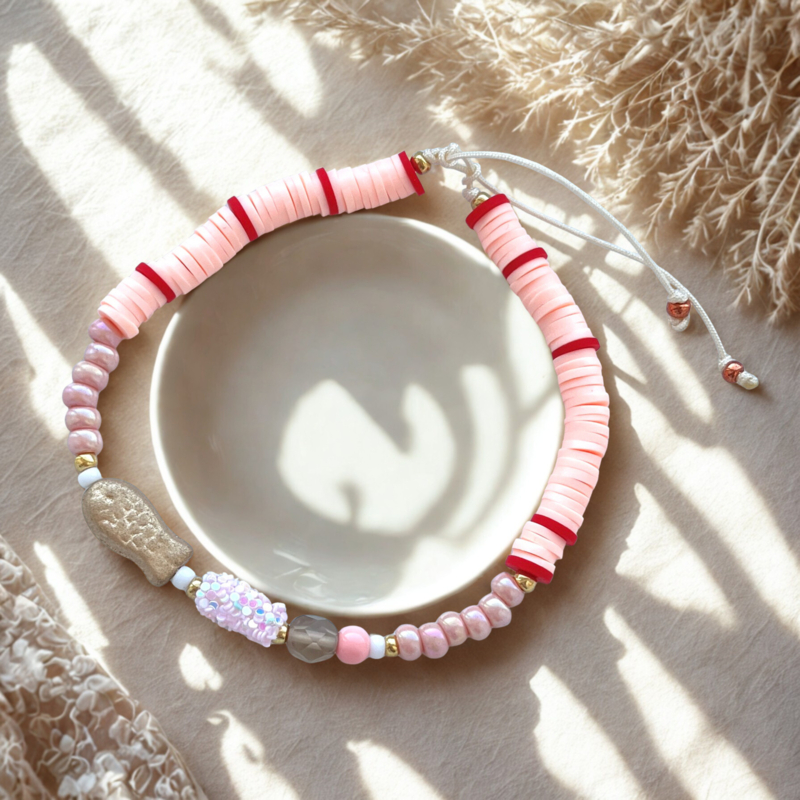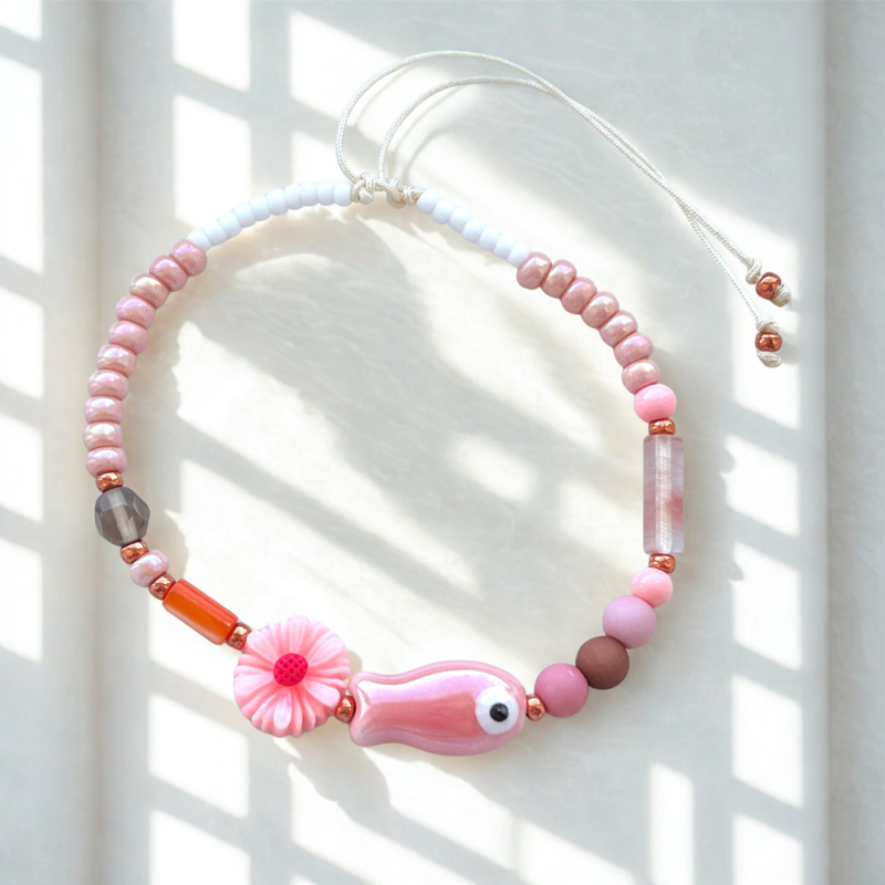 - Rijg alle materialen (incl. bedels in het midden)volgens ons voorbeeld of naar eigen inzicht