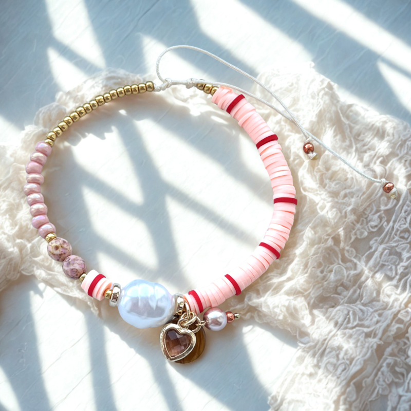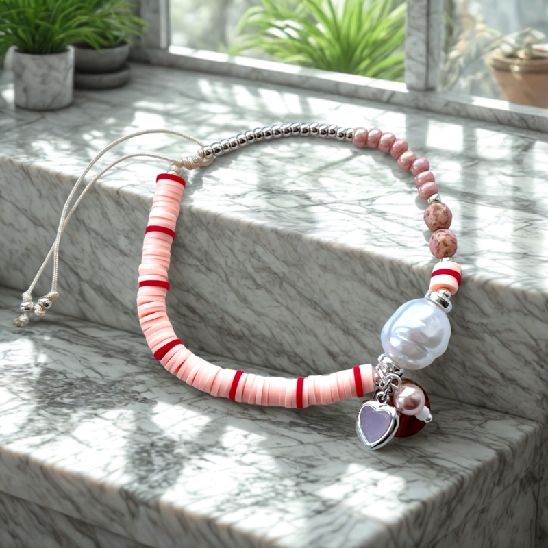 - Maak de ringetjes vast aan zowel de zelf gemaakte bedel als aan de hangers van crystal glas hart pink