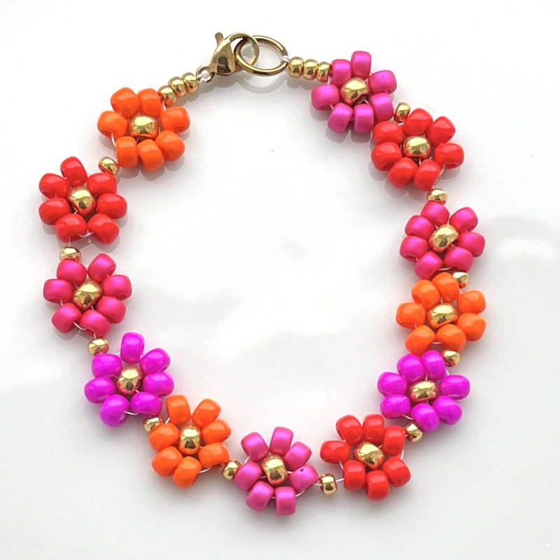 Dit super schattige bloem armbandje is gemaakt van 6/0 Miyuki kraaltjes en stainless (RVS) sluiting en jij maakt dit armbandje helemaal zelf met een beetje hulp van ons. De werkwijze ontvang je door middel van een video tutorial. Je kunt kiezen uit de combinatie Goud (meerpijs) of Zilver (afwijkend van het orgineel).